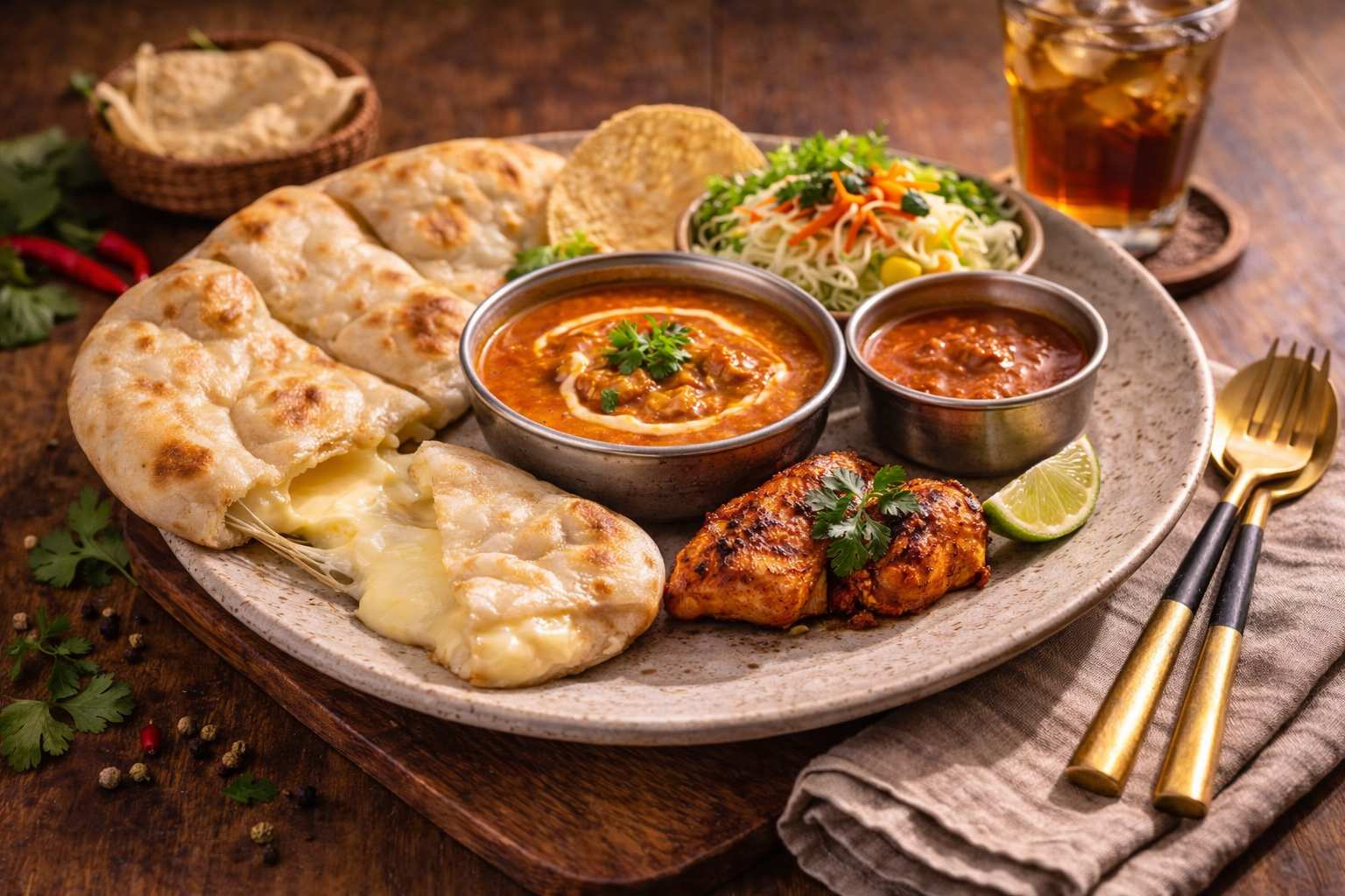 Choice of 1 curry. Cheese naan. Papad. Soft drink. One refill.